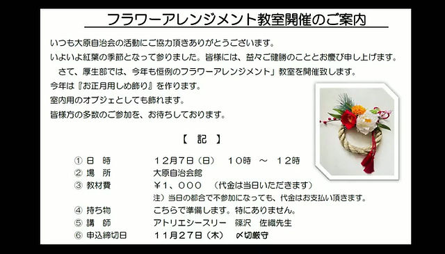 12月7日に、アトリエシースリーの篠沢佐織生をお迎えし、フラワーアレンジメントのワークショップを行いました。28名の参加者が集まり、それぞれの個性を生かした しめ縄飾り を楽しみながら制作しました。参加者の皆さんには、満ち足りた表情で作品を持ち帰えっていただきました。